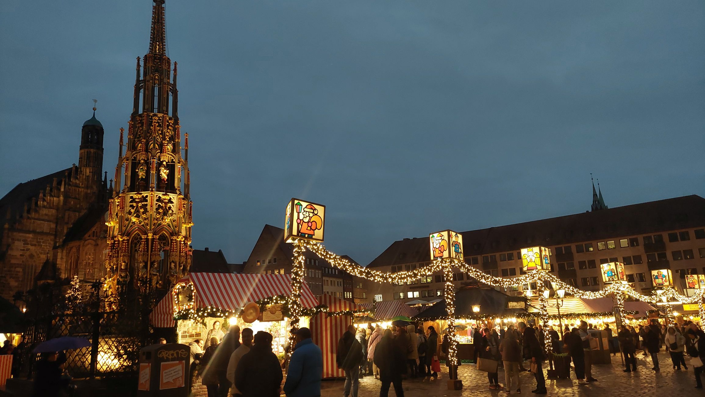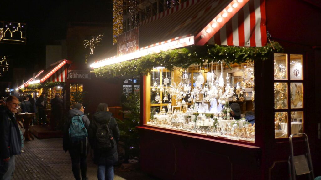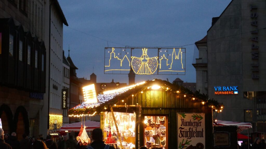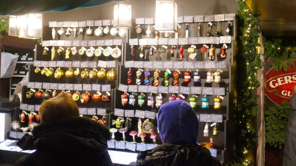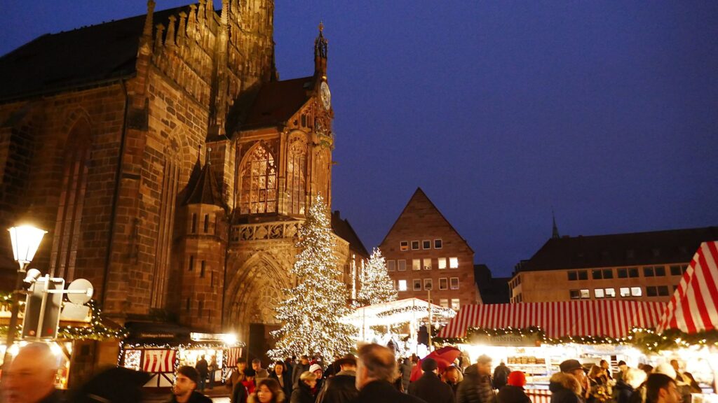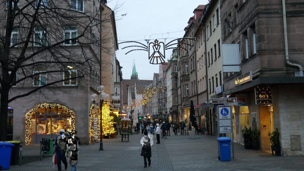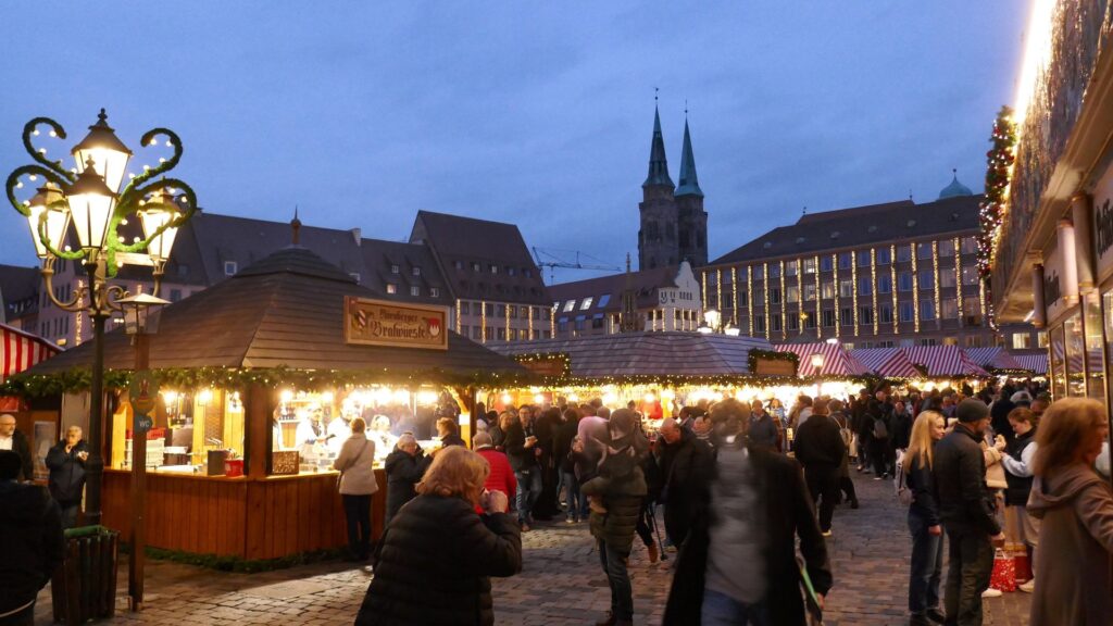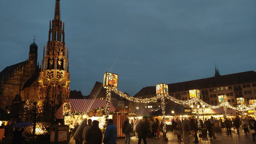 10.12.: Einen Tag später als geplant beginnt heute unsere Adventmarkt-Tour in Deutschland. Mit dem Zug geht es am Vormittag nach Nürnberg. Von Wien nach Nürnberg brauchen wir mit dem Zug nur knapp über 4 Stunden. Am Nachmittag kommen wir an und nach kurzer Rast in unserem Hotel gehen wir los zum Christkindlesmarkt. Zum Glück hält sich der Menschenandrang vorerst in Grenzen. Der Markt ist nett, aber ziemlich viele Punsch- und Essstände und ziemlich wenig Hütten mit Handwerk und Weihnachtsdeko.