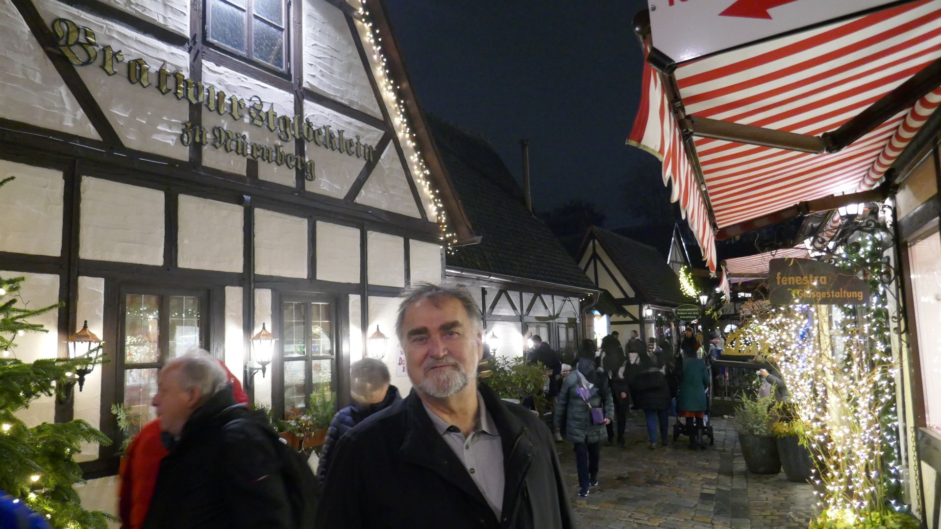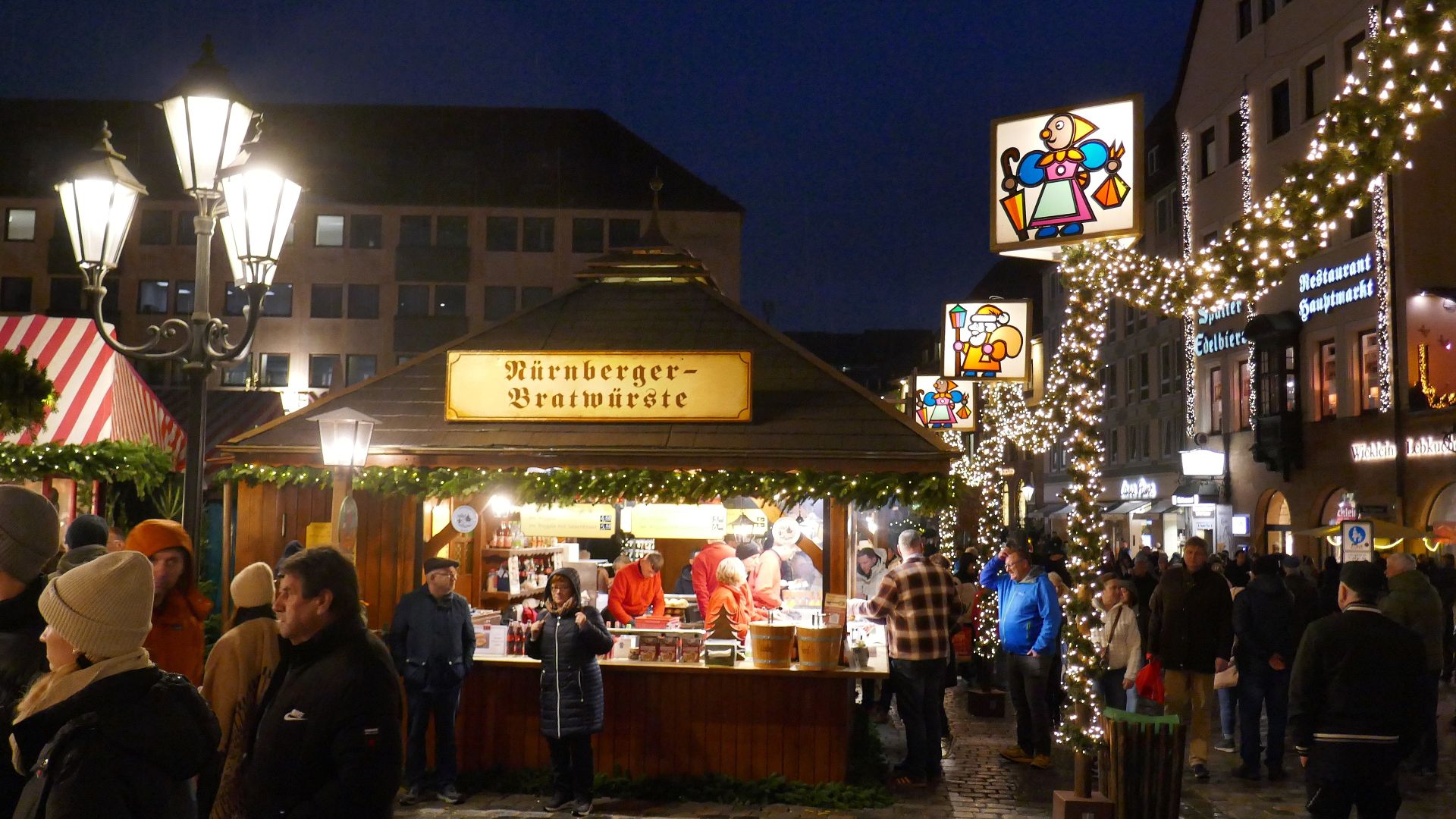 Wir spazieren durch den Markt und natürlich müssen wir auch ein Weckerl mit den Nürnberger Rostbratwürsteln und Sauerkraut essen. Schmeckt ausgezeichnet!!