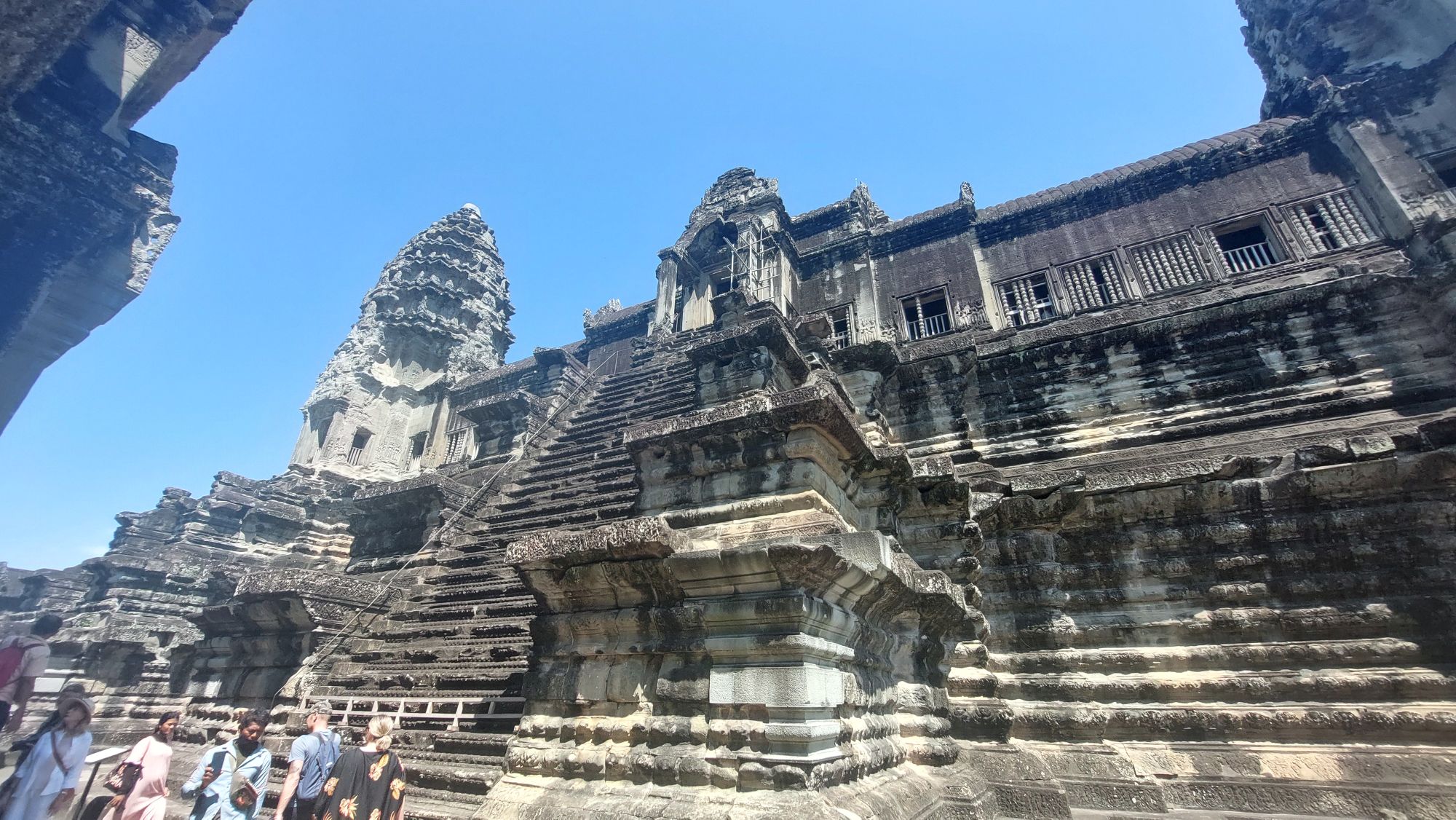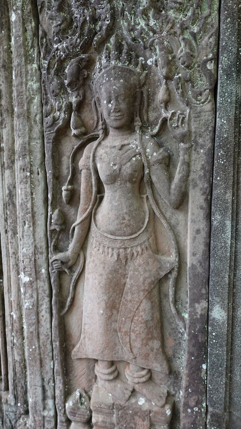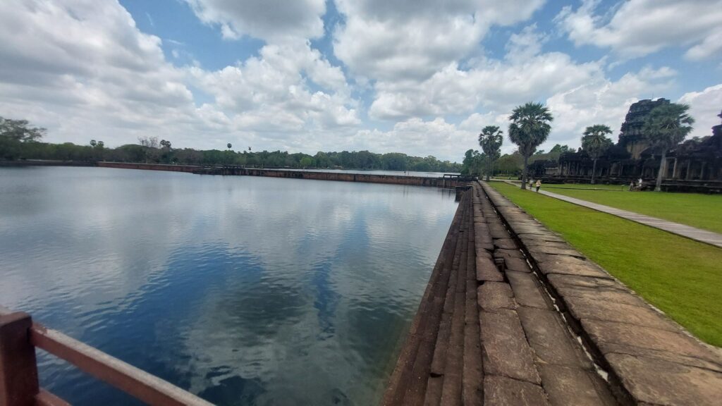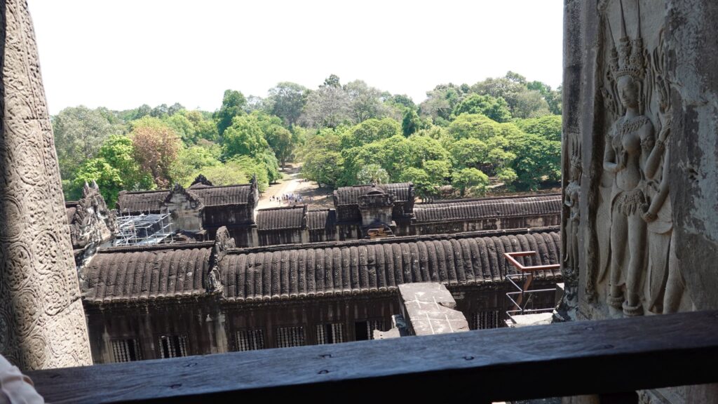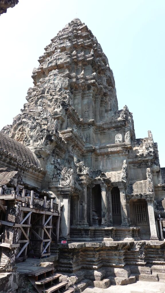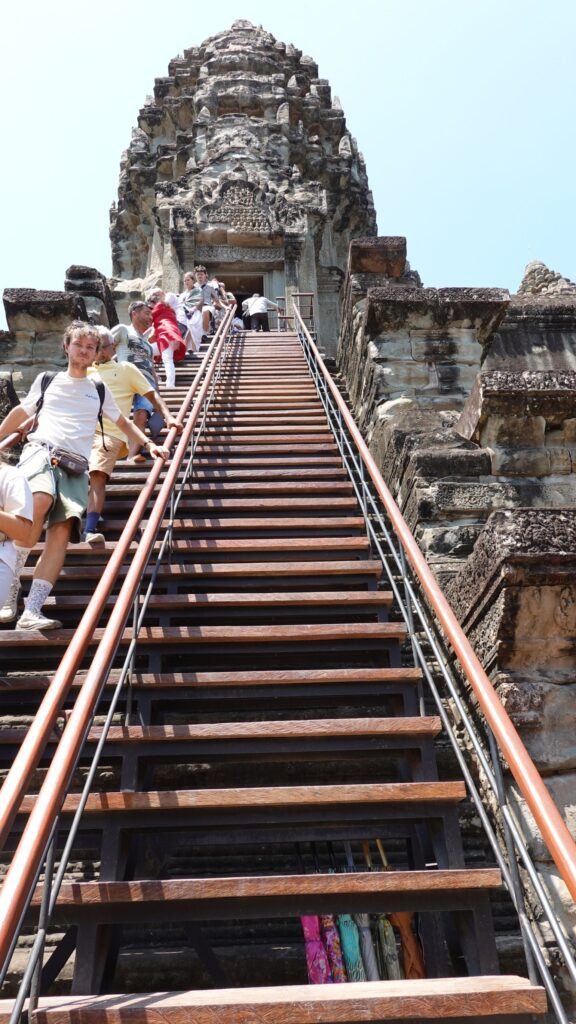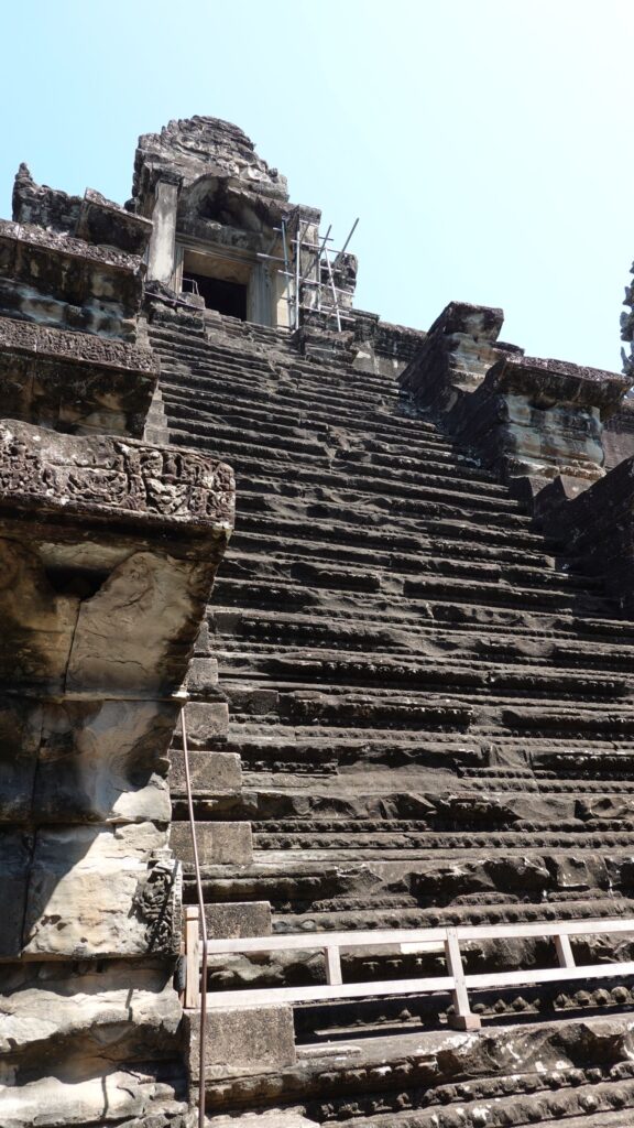 Ein 200m breiter Wassergraben in Ausmaß von 1500x1300m umgibt die Anlage. Auf der 1.Plattform ist ein Kreuzgang mit Reliefs, die das Leben der Menschen damals zeigen. Dann kommt die 2. Plattform. In der Mitte steht der Tempel mit 5 Türmen (Prasats) in Form von Lotusblüten. Insgesamt ist Angkor Wat 55m hoch. Am Hauptturm kann man über eine sehr steile Holztreppe nach oben steigen. Das ist zwar wirklich mühsam, aber der Blick über die Anlage lohnt sich.