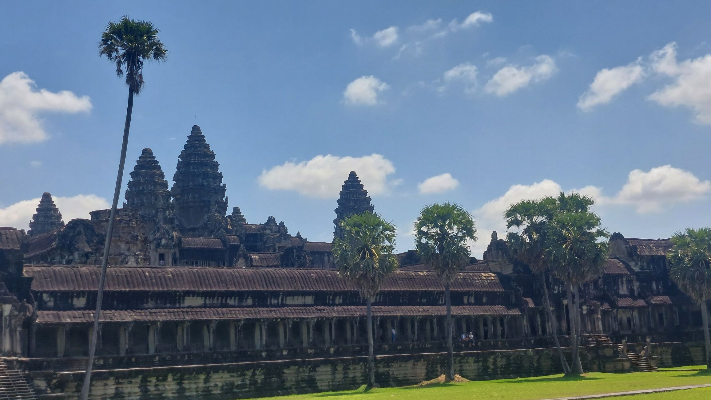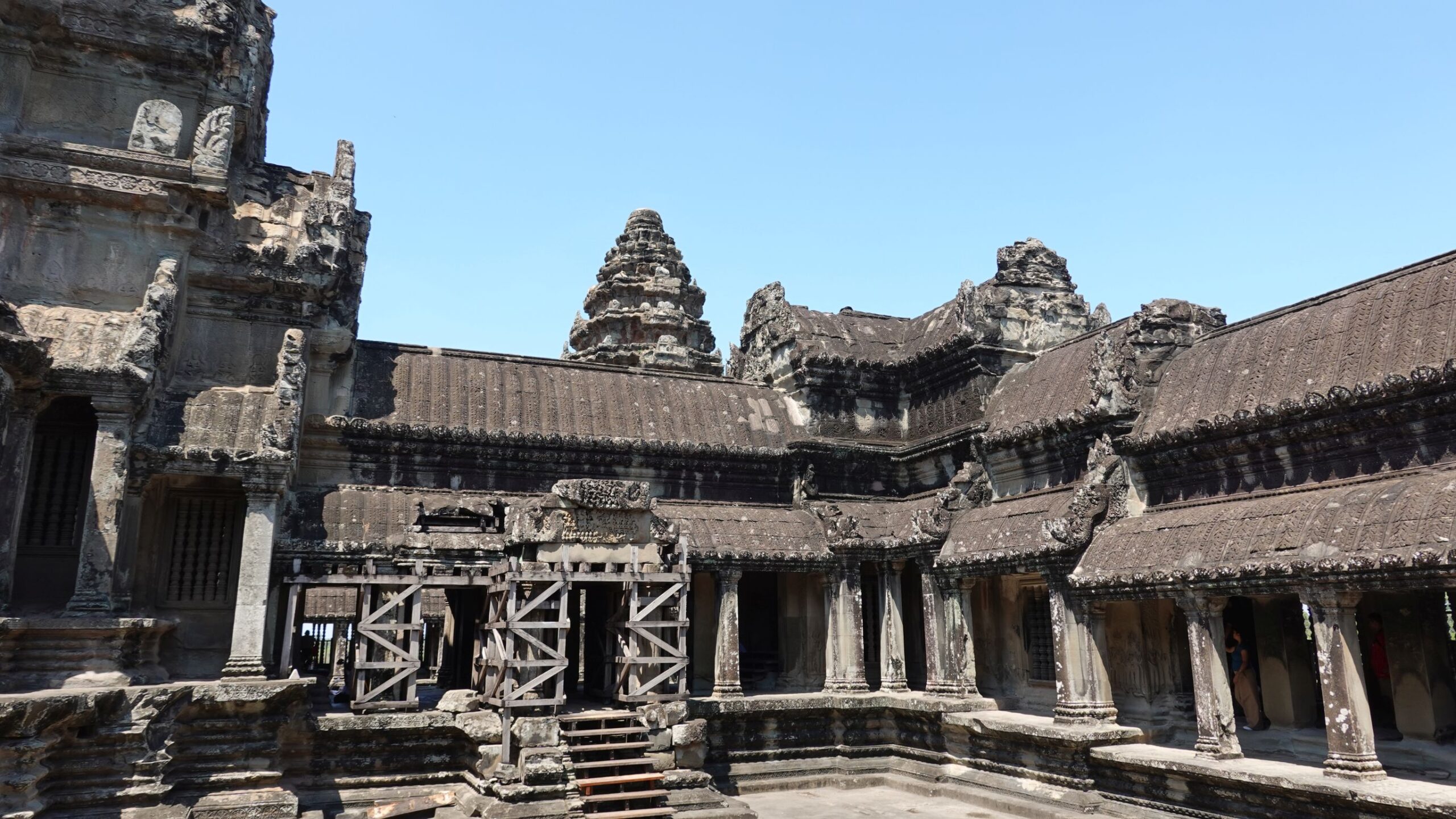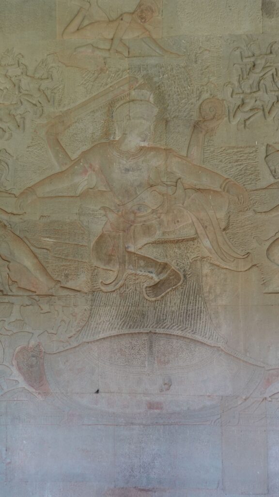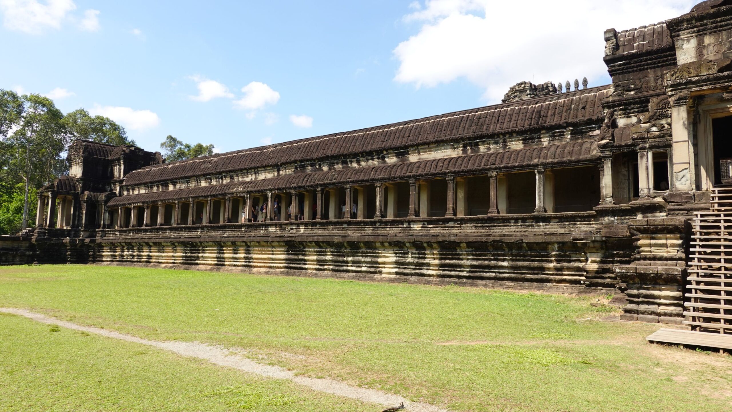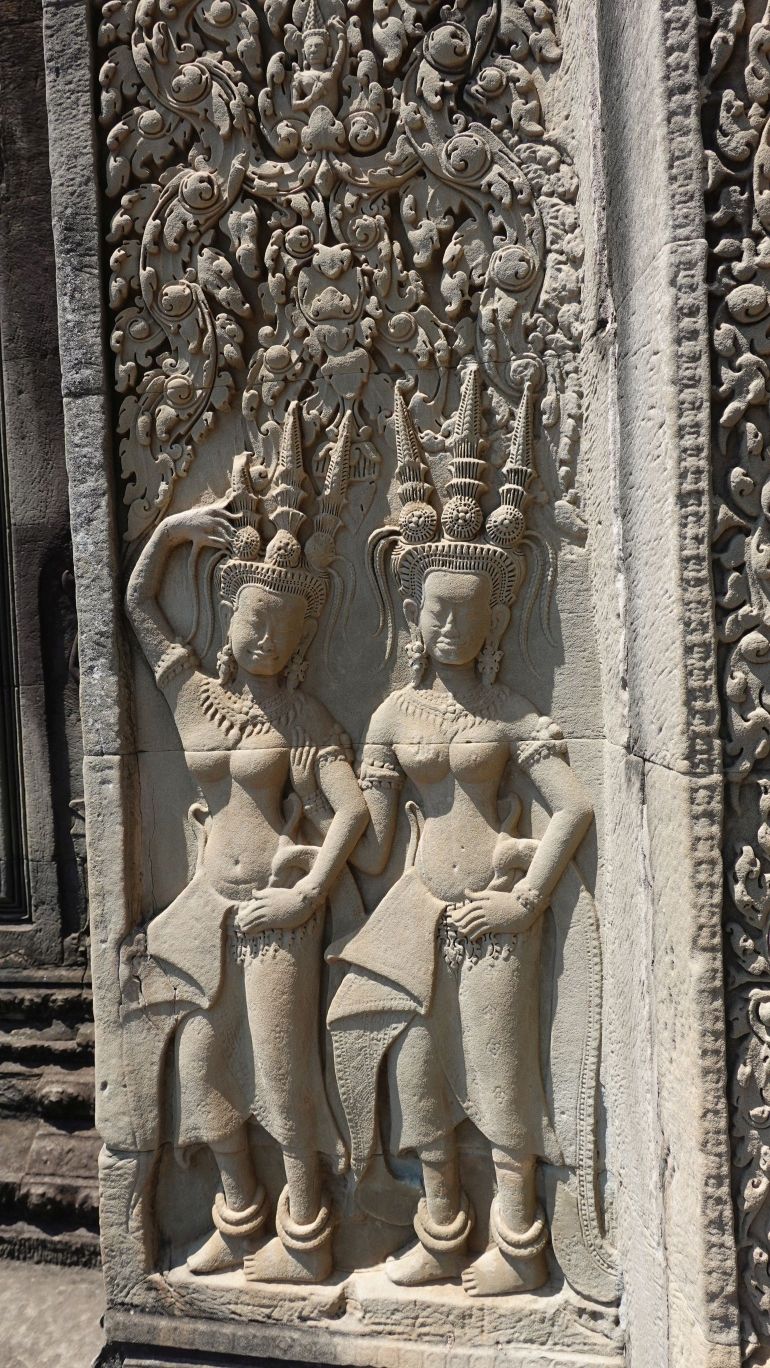 Ein 200m breiter Wassergraben in Ausmaß von 1500x1300m umgibt die Anlage. Auf der 1.Plattform ist ein Kreuzgang mit Reliefs, die das Leben der Menschen damals zeigen. Dann kommt die 2. Plattform. In der Mitte steht der Tempel mit 5 Türmen (Prasats) in Form von Lotusblüten. Insgesamt ist Angkor Wat 55m hoch. Am Hauptturm kann man über eine sehr steile Holztreppe nach oben steigen. Das ist zwar wirklich mühsam, aber der Blick über die Anlage lohnt sich.