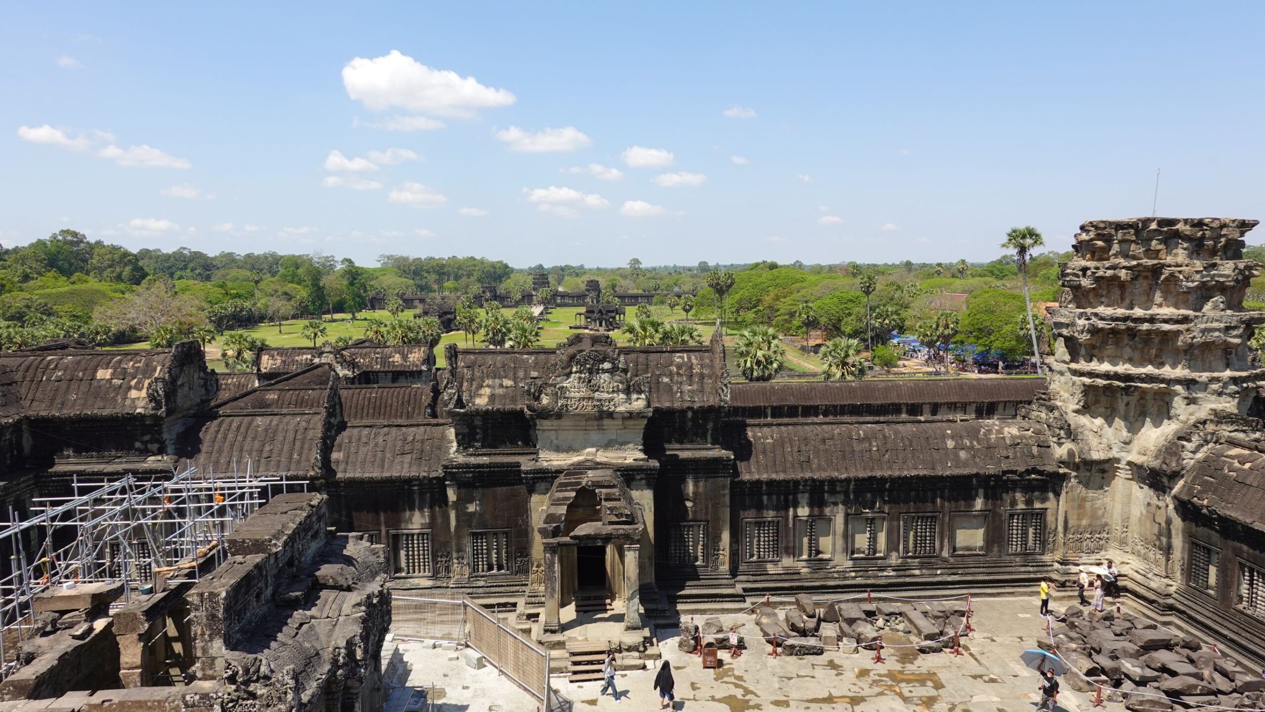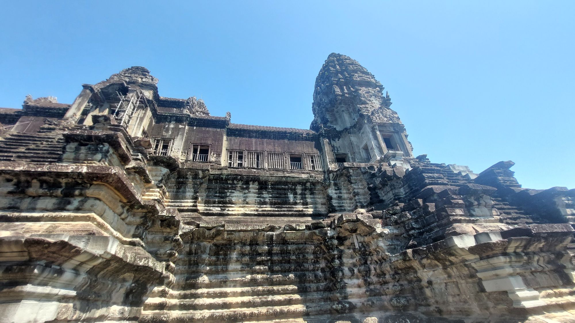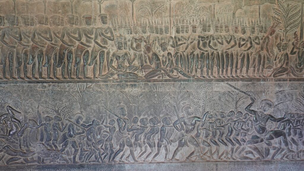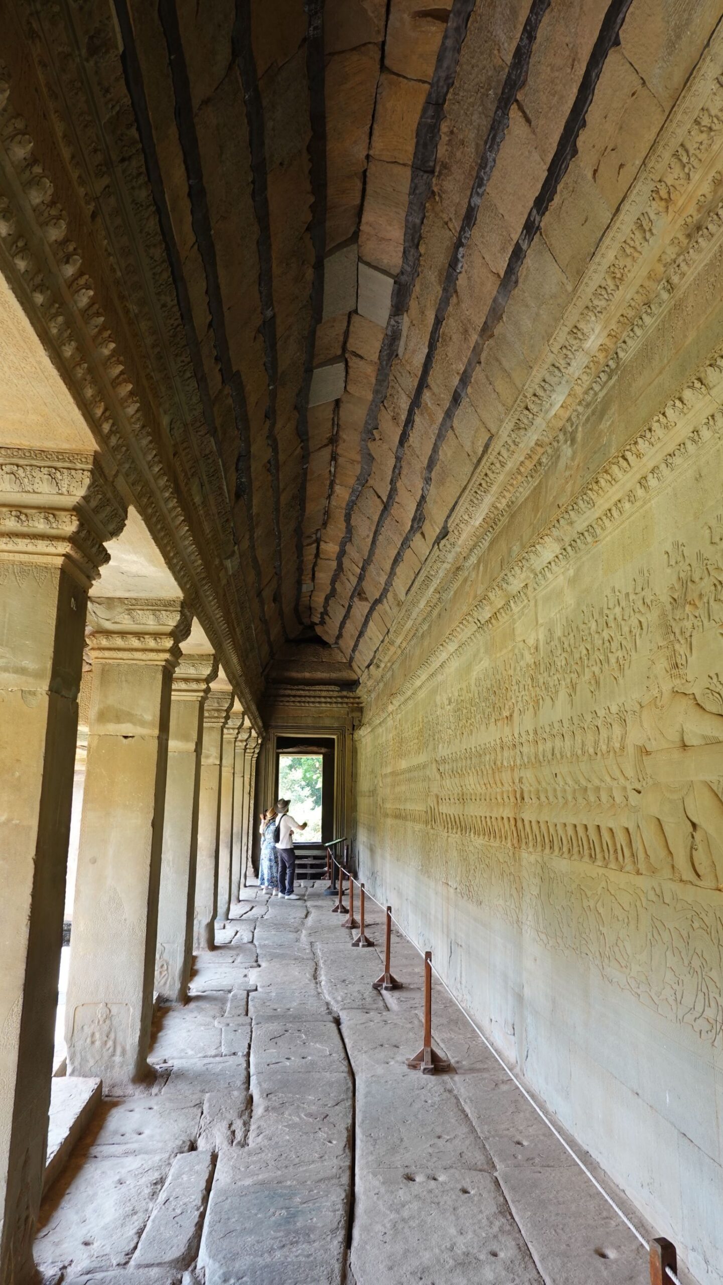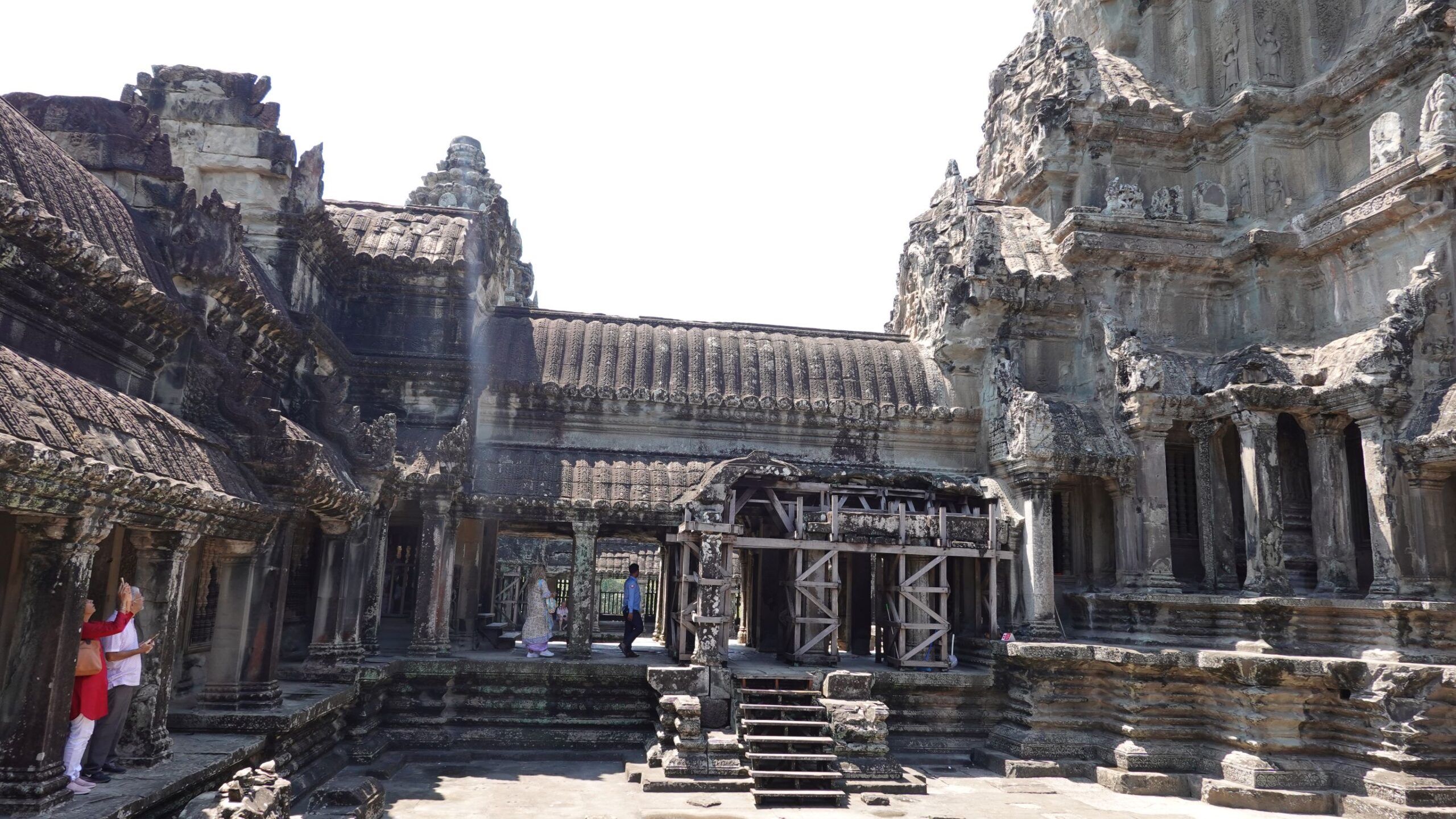 Ein 200m breiter Wassergraben in Ausmaß von 1500x1300m umgibt die Anlage. Auf der 1.Plattform ist ein Kreuzgang mit Reliefs, die das Leben der Menschen damals zeigen. Dann kommt die 2. Plattform. In der Mitte steht der Tempel mit 5 Türmen (Prasats) in Form von Lotusblüten. Insgesamt ist Angkor Wat 55m hoch. Am Hauptturm kann man über eine sehr steile Holztreppe nach oben steigen. Das ist zwar wirklich mühsam, aber der Blick über die Anlage lohnt sich.