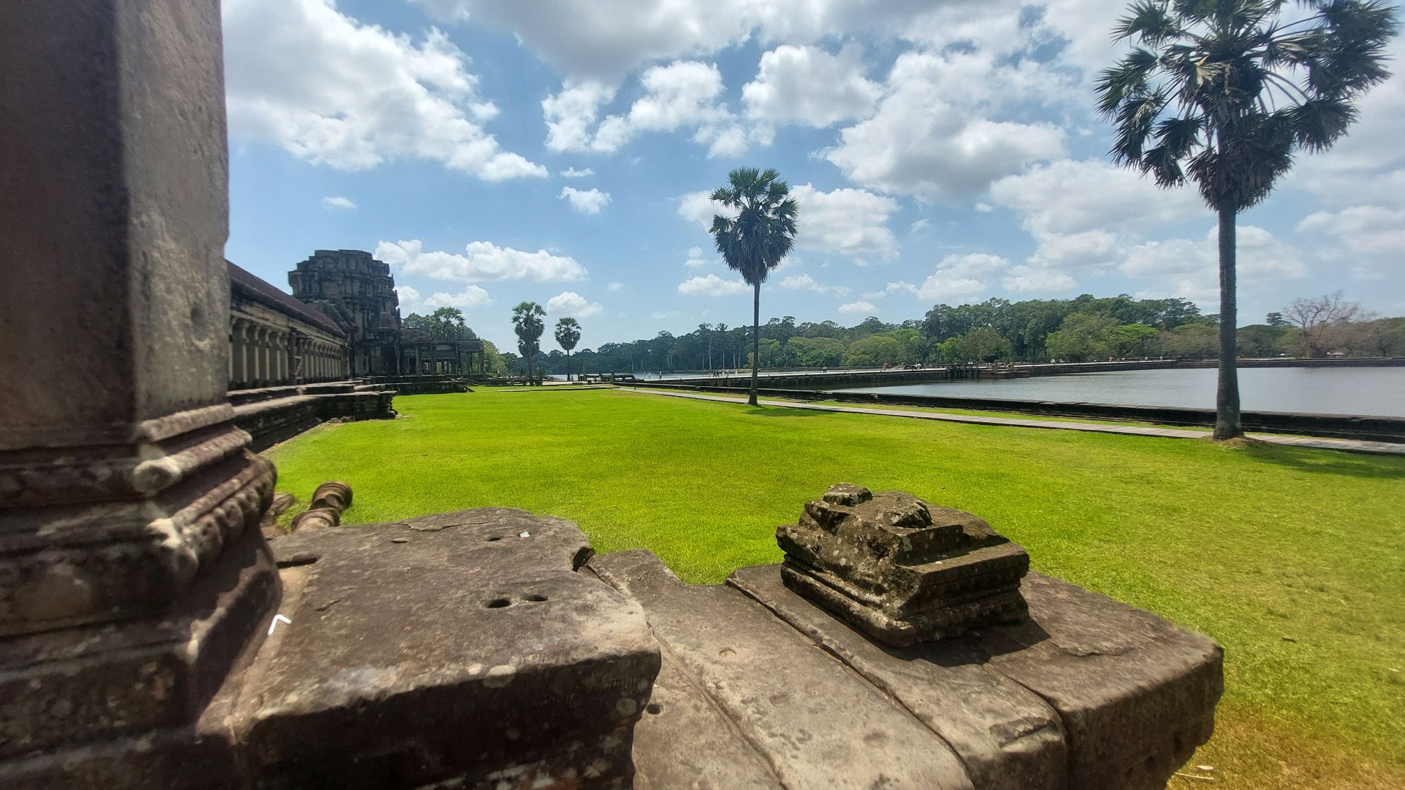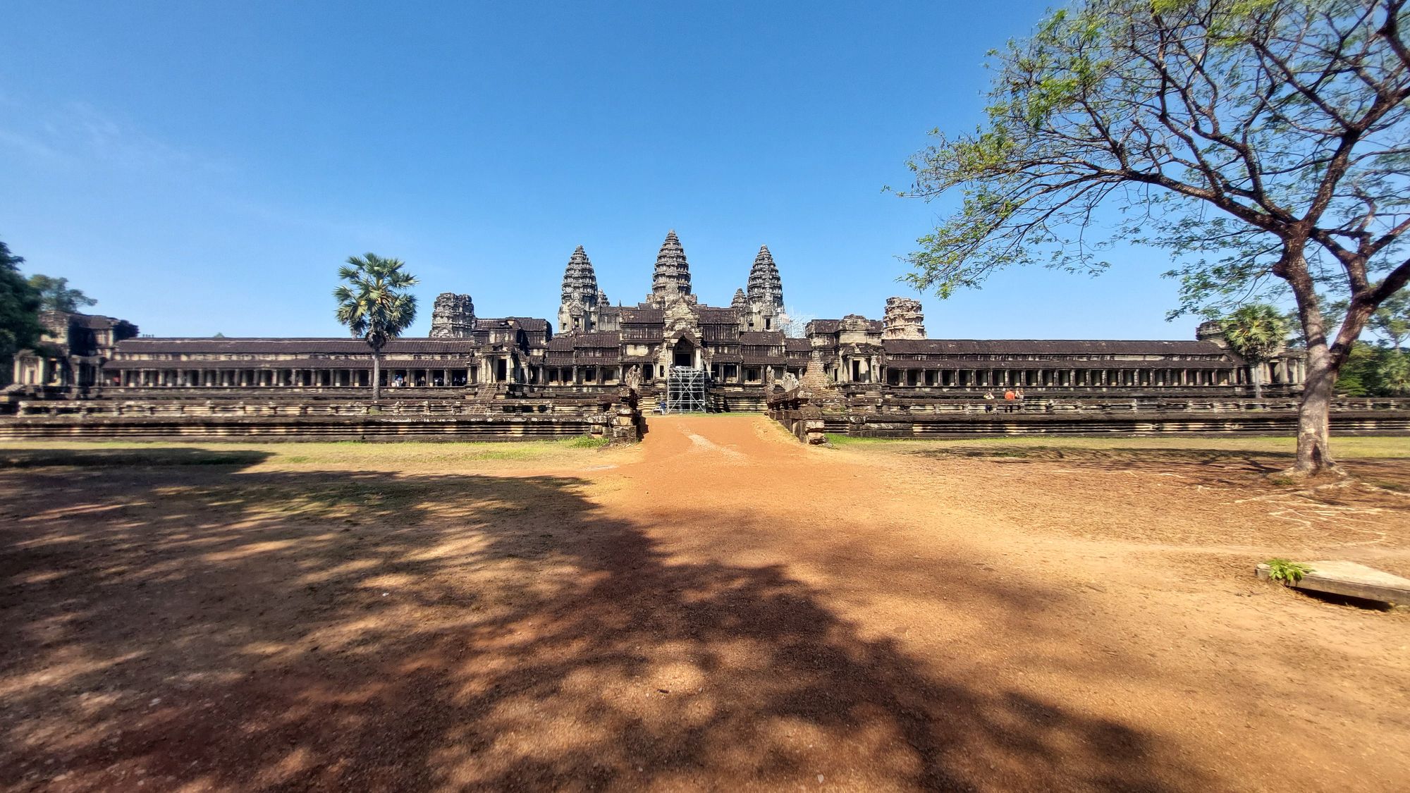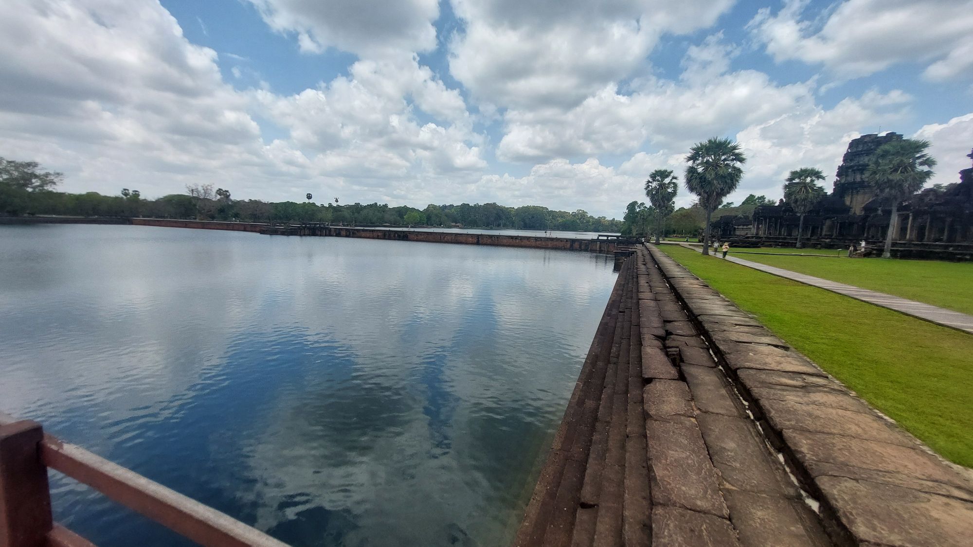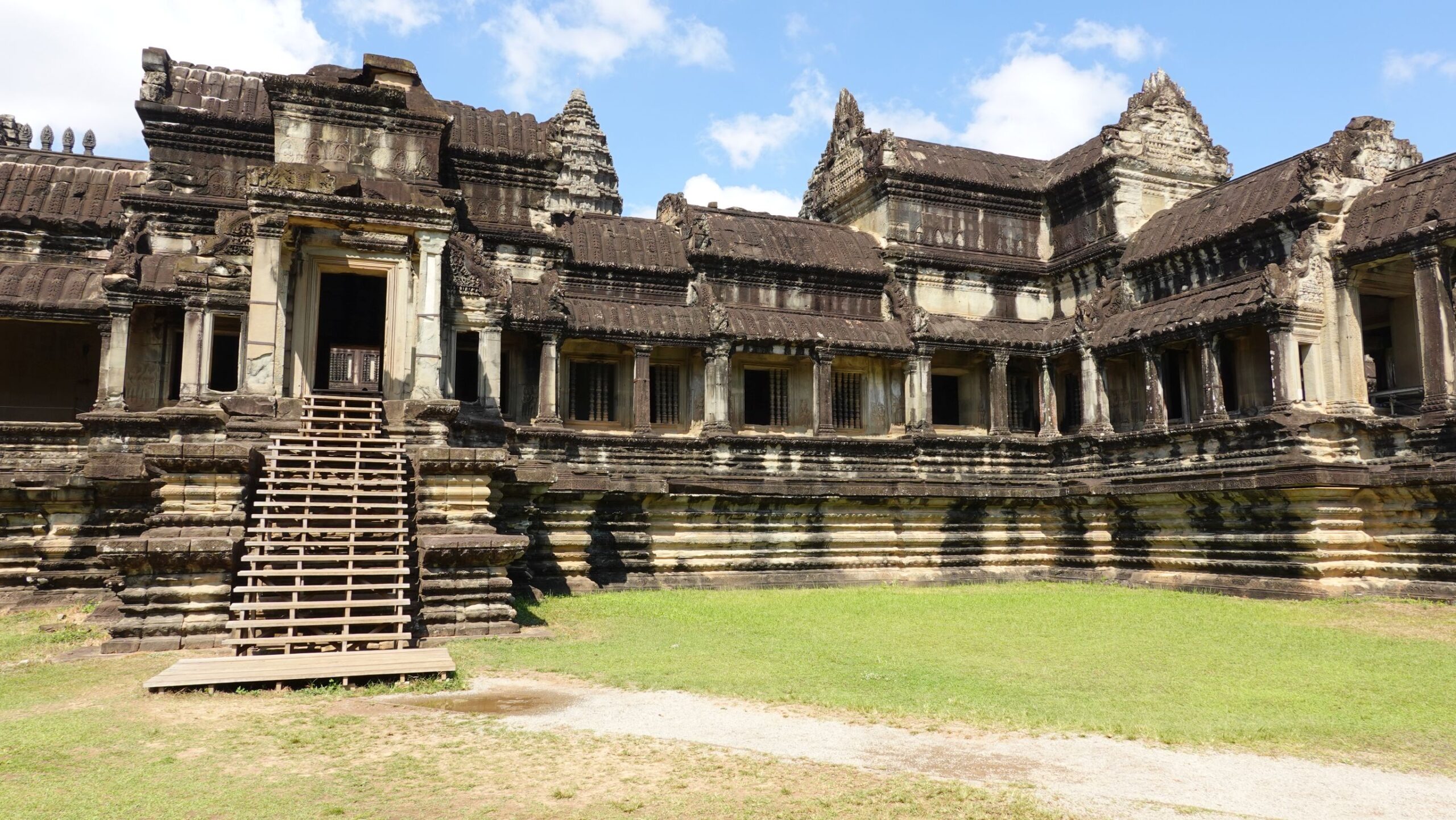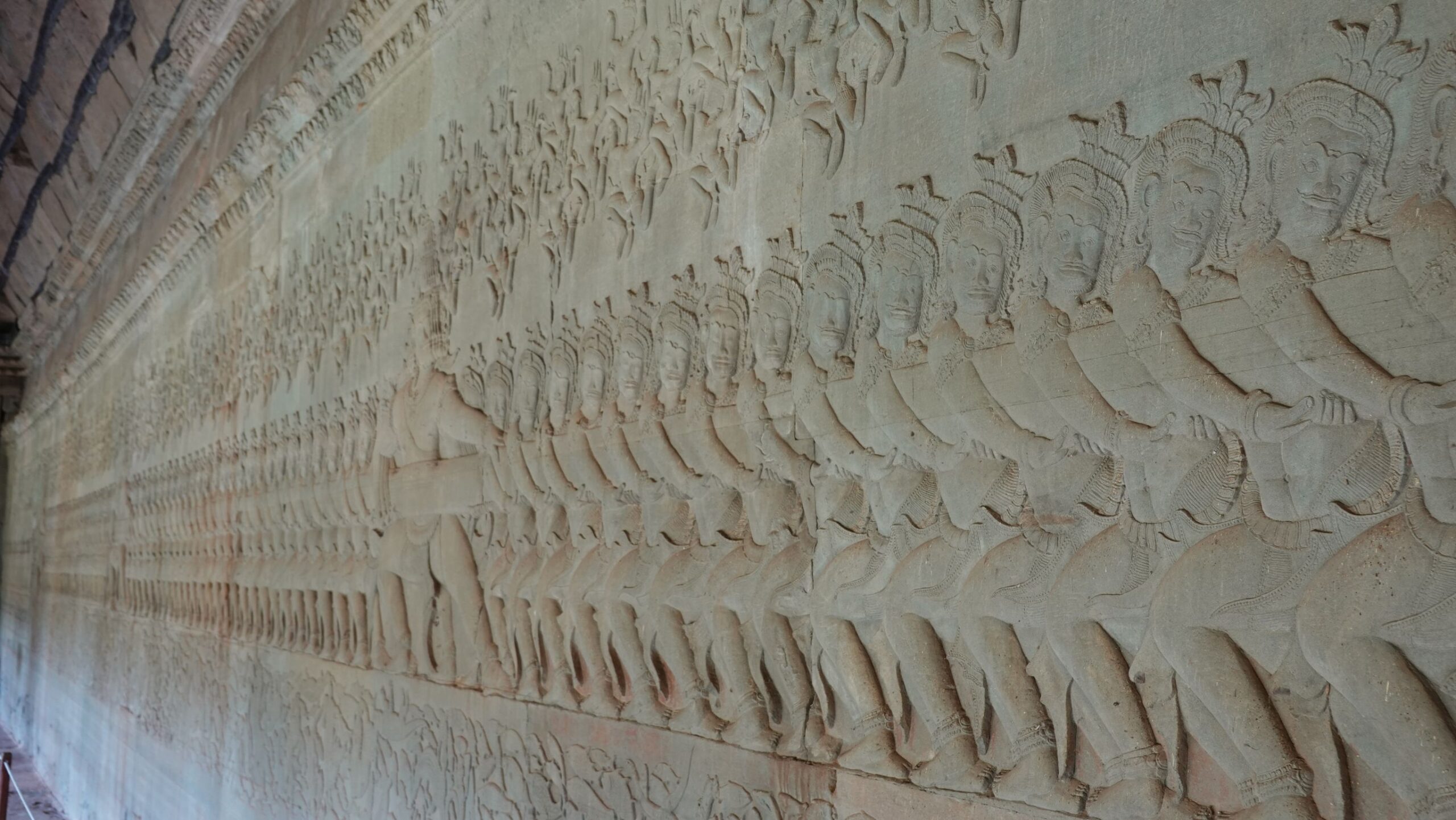 Ein 200m breiter Wassergraben in Ausmaß von 1500x1300m umgibt die Anlage. Auf der 1.Plattform ist ein Kreuzgang mit Reliefs, die das Leben der Menschen damals zeigen. Dann kommt die 2. Plattform. In der Mitte steht der Tempel mit 5 Türmen (Prasats) in Form von Lotusblüten. Insgesamt ist Angkor Wat 55m hoch. Am Hauptturm kann man über eine sehr steile Holztreppe nach oben steigen. Das ist zwar wirklich mühsam, aber der Blick über die Anlage lohnt sich.