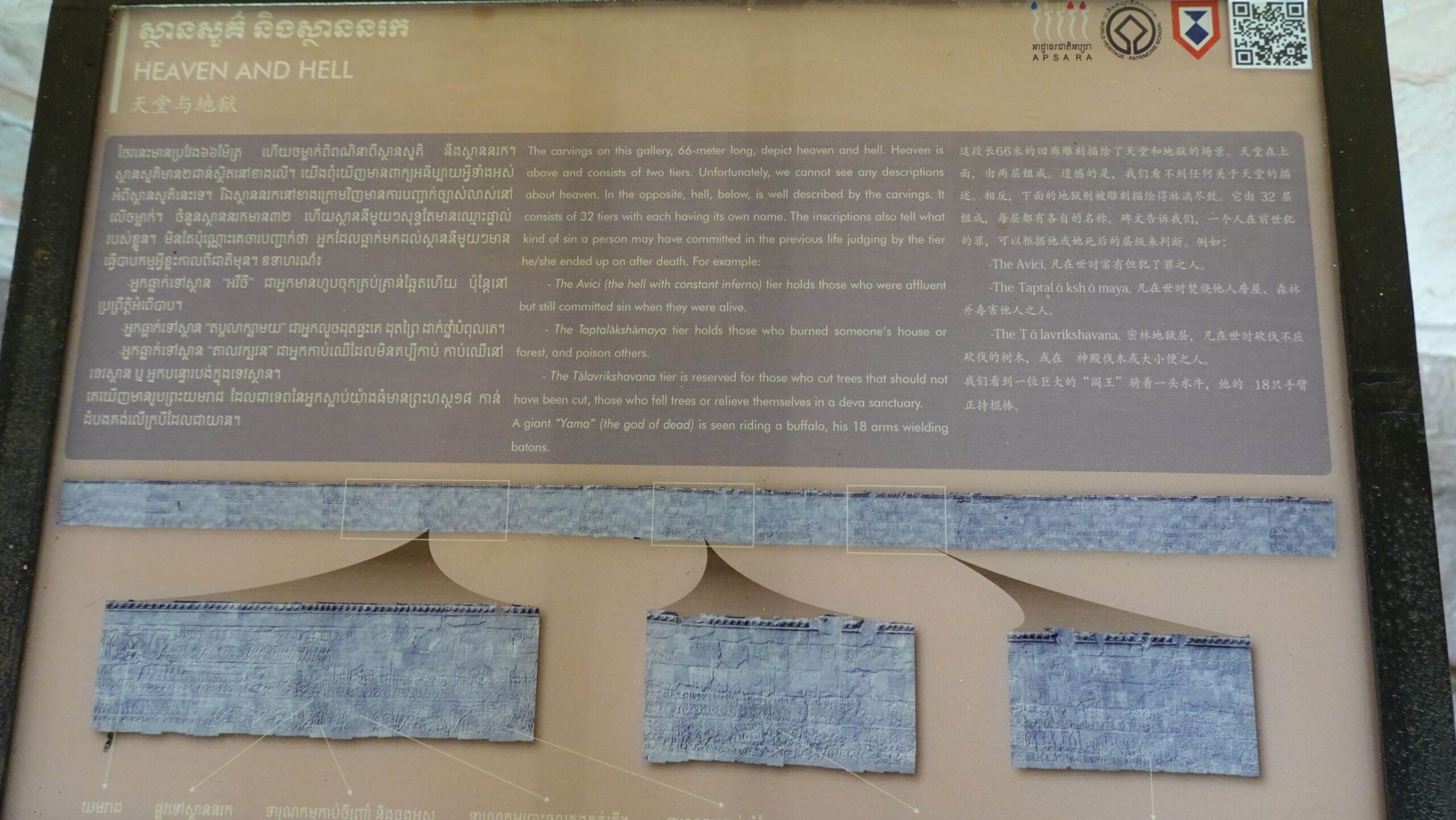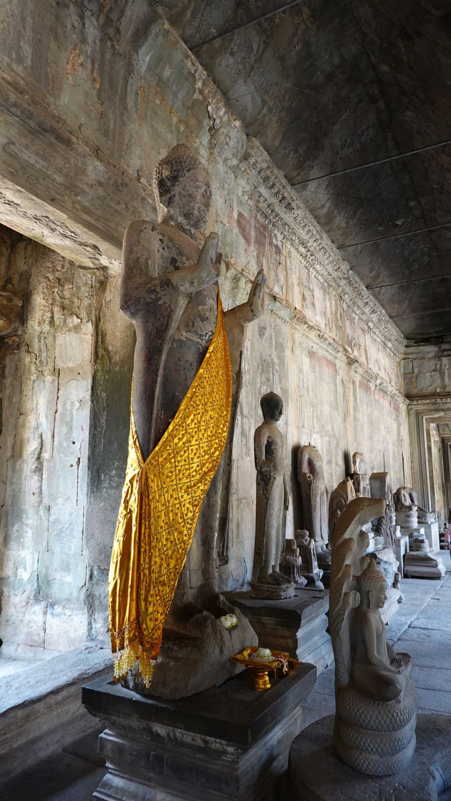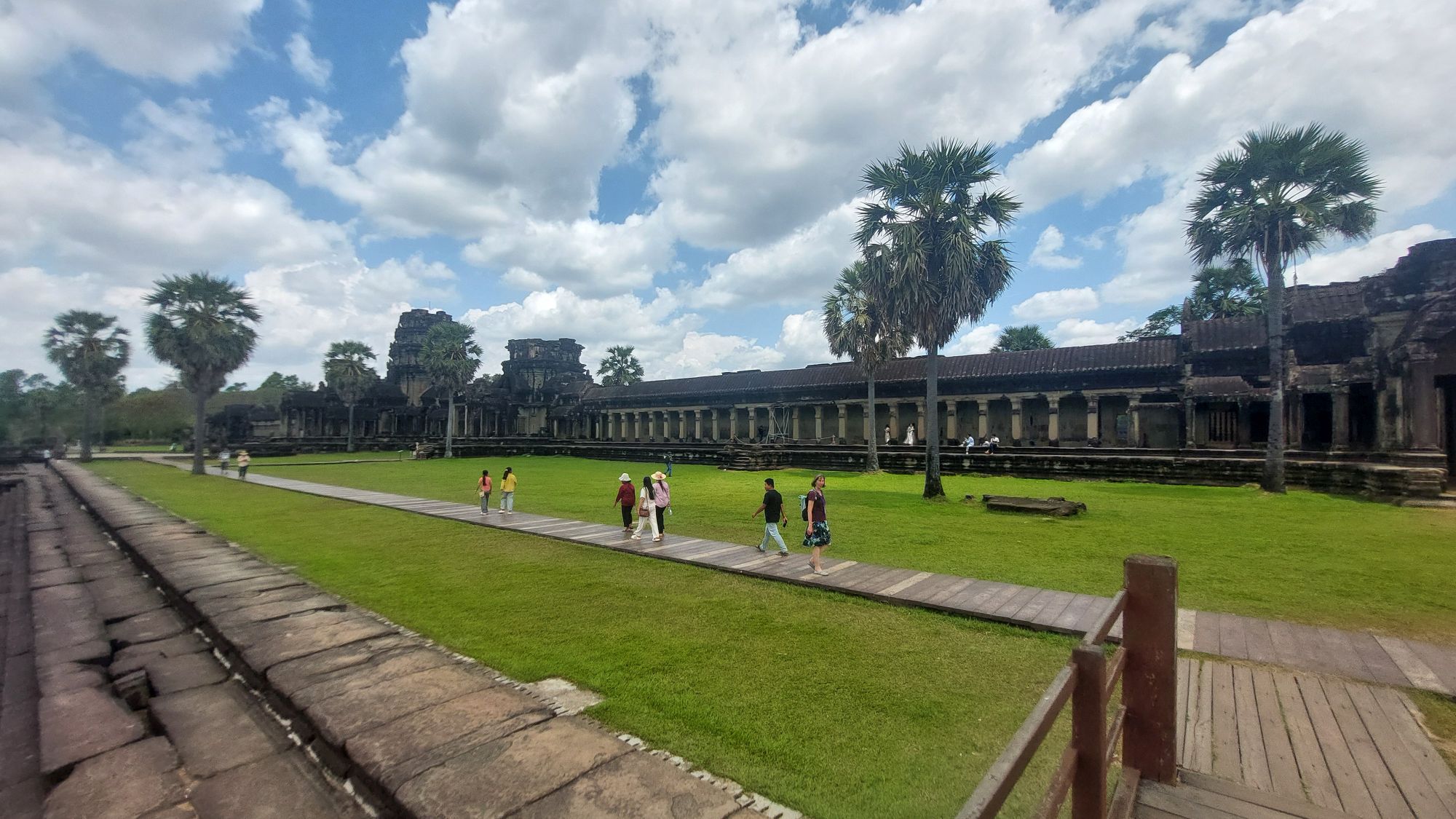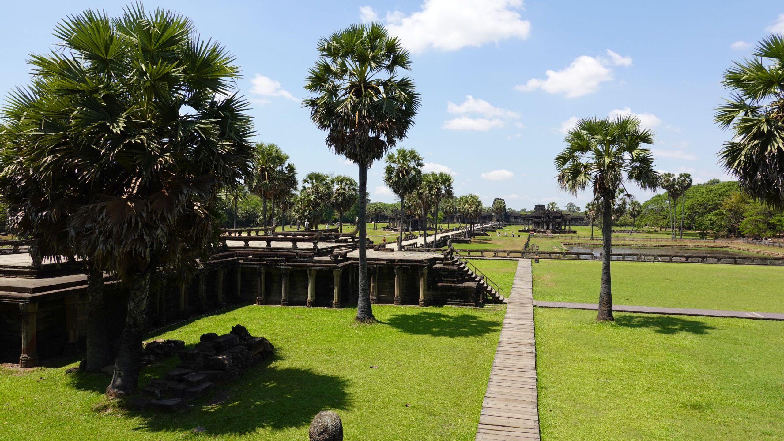 Ein 200m breiter Wassergraben in Ausmaß von 1500x1300m umgibt die Anlage. Auf der 1.Plattform ist ein Kreuzgang mit Reliefs, die das Leben der Menschen damals zeigen. Dann kommt die 2. Plattform. In der Mitte steht der Tempel mit 5 Türmen (Prasats) in Form von Lotusblüten. Insgesamt ist Angkor Wat 55m hoch. Am Hauptturm kann man über eine sehr steile Holztreppe nach oben steigen. Das ist zwar wirklich mühsam, aber der Blick über die Anlage lohnt sich.