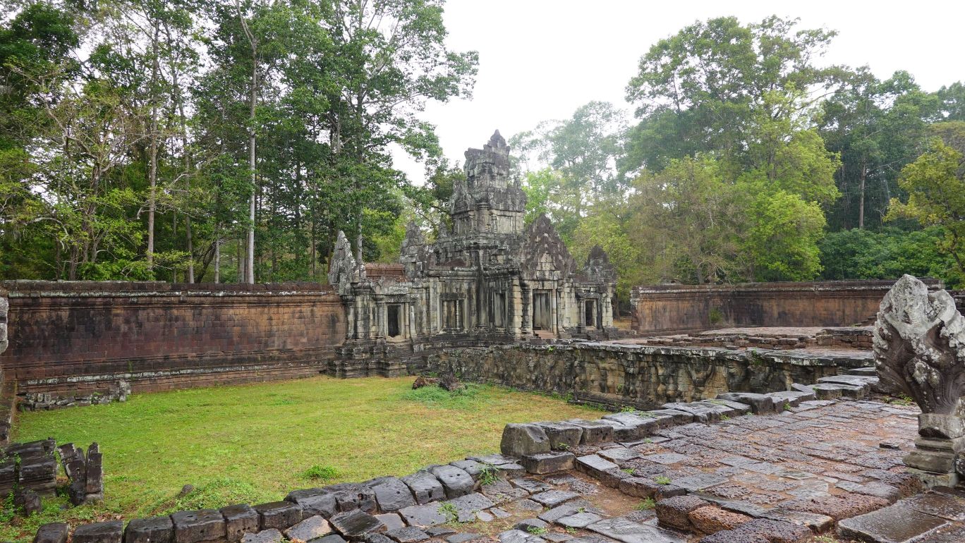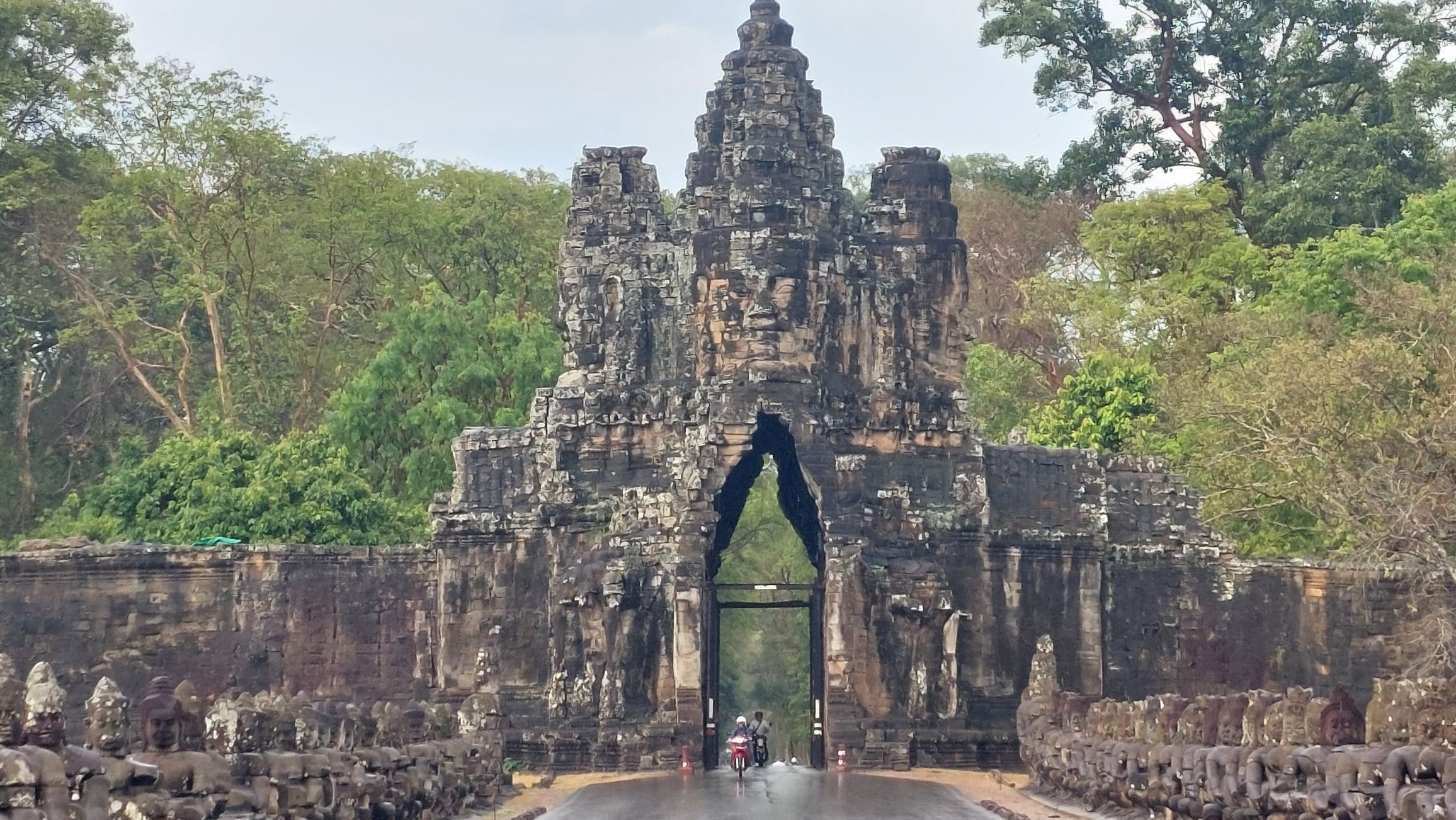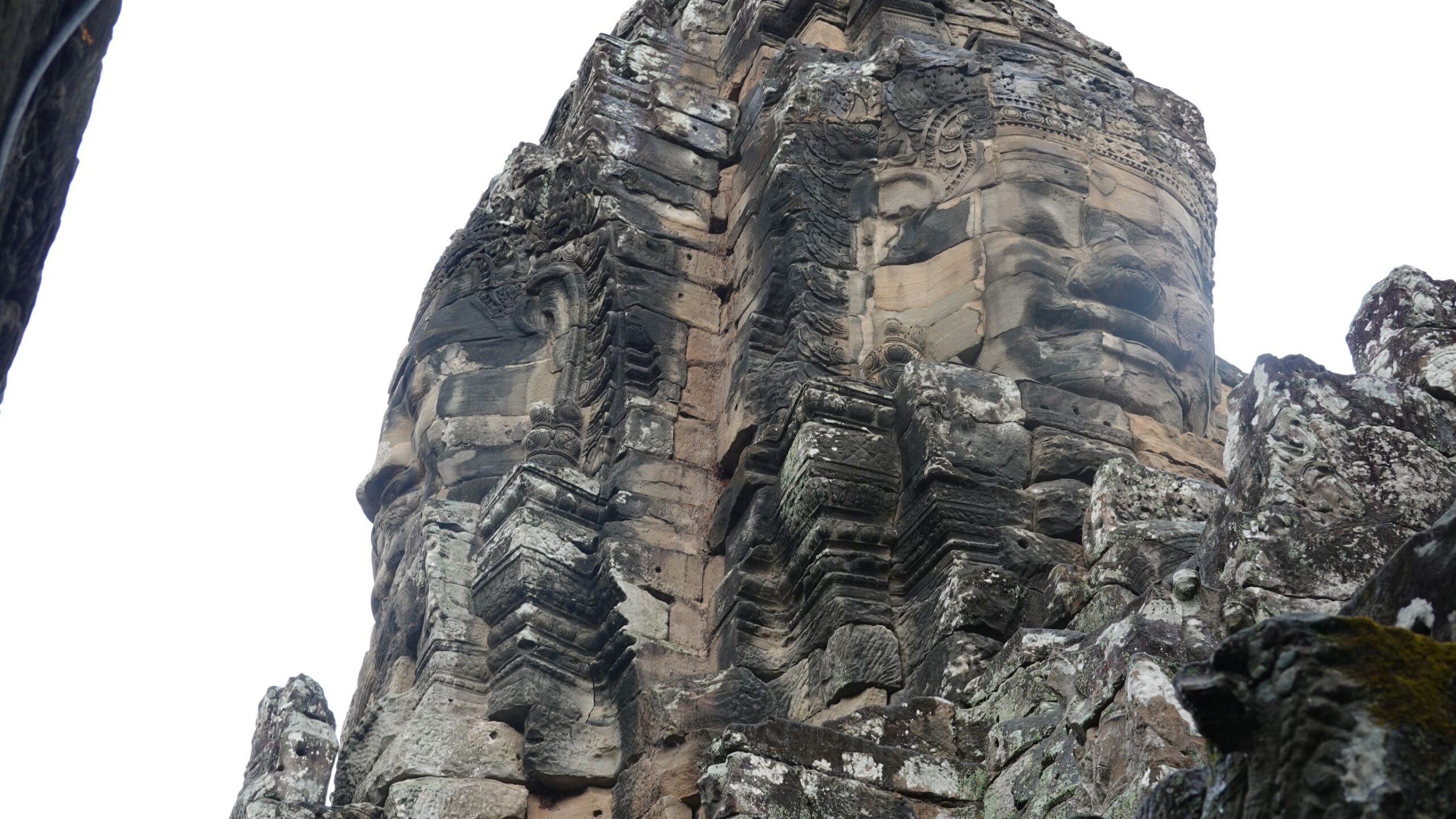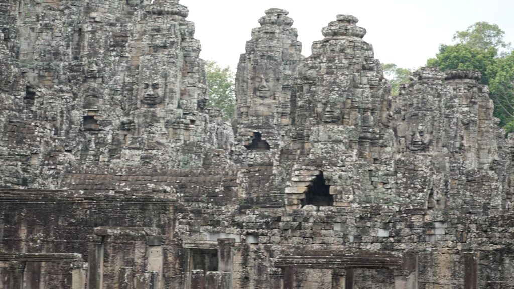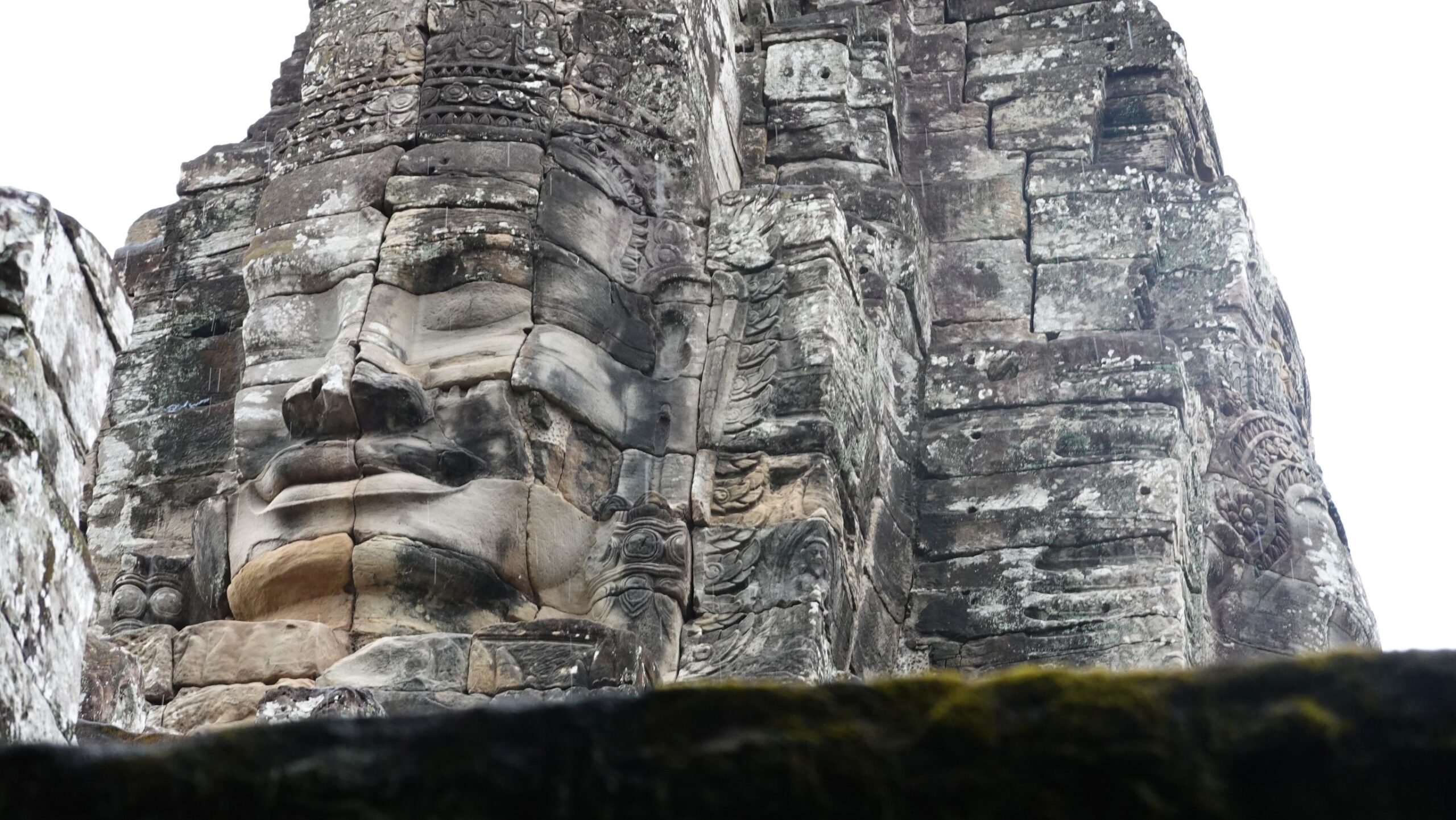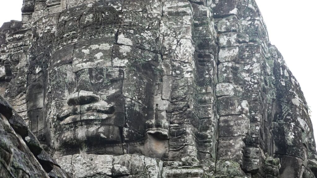 Leider hat es heftig zu regnen begonnen, sodass der Eindruck, insbesondere von den riesigen Steingesichtern auf den Türmen rundum. Wir marschieren mit Regenschirm durch die Anlage und ein paar Fotos sind ja durchaus gelungen.