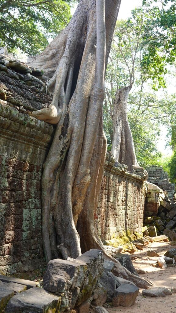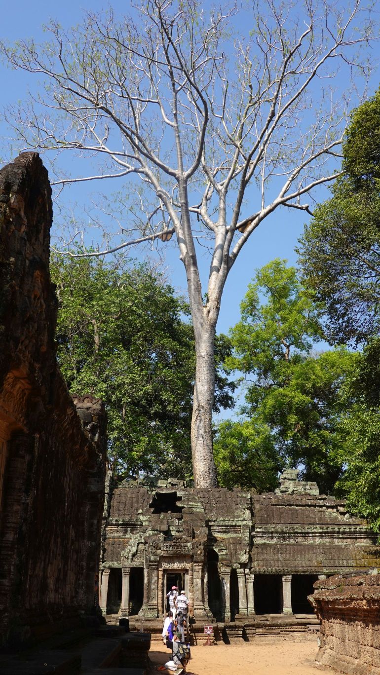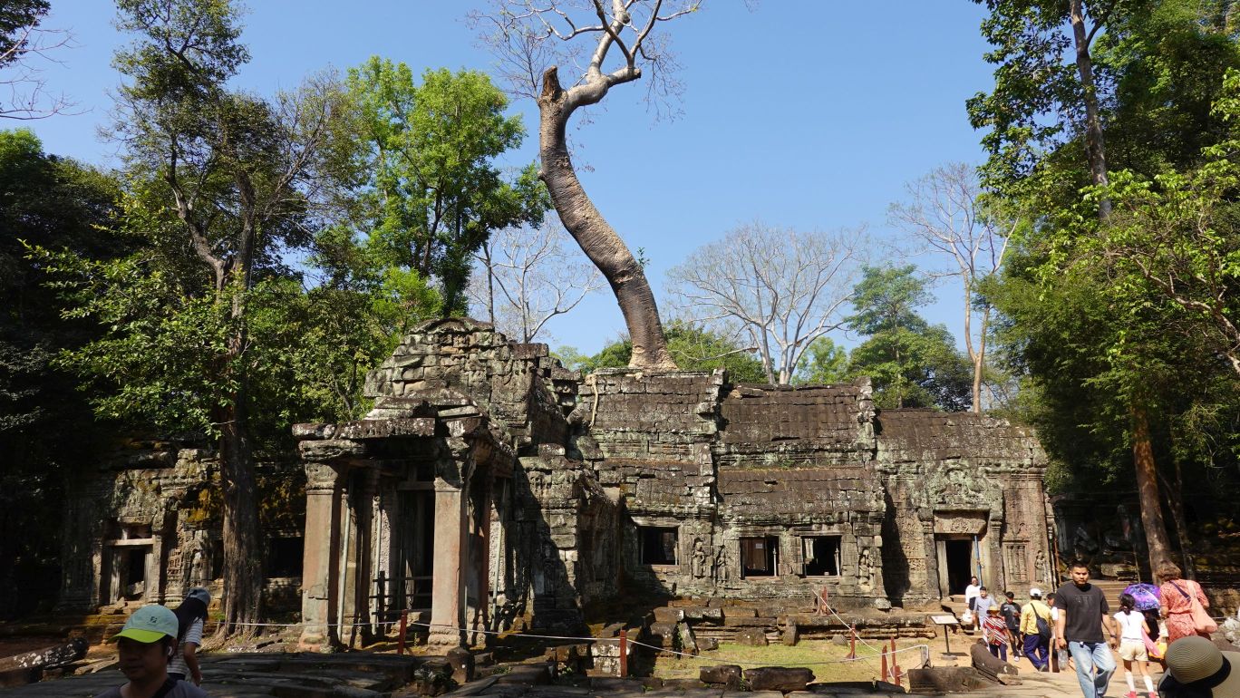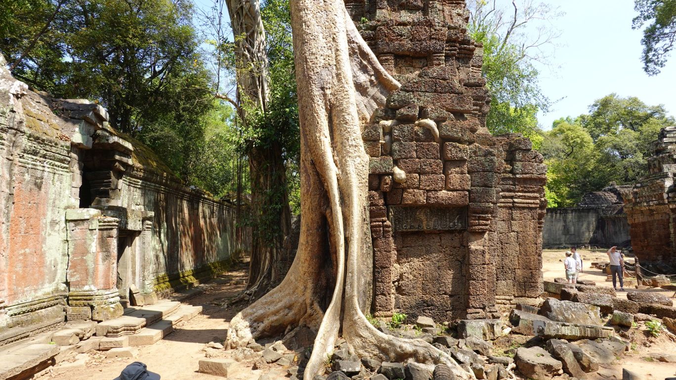 07.03: Wir wandeln auf den Spuren von „Lara Croft: Tomb Raider“. Teile des Films wurden in den Tempelruinen vom „Ta Prohm“ gedreht. Die Anlage besuchen wir heute. Die Tempelruinen stehen mitten im Dschungel und teilweise sind die Gebäude mit Lianen überwachsen und die Bäume klammern sich an den Steinen fest. Das schaut richtig mystisch aus.