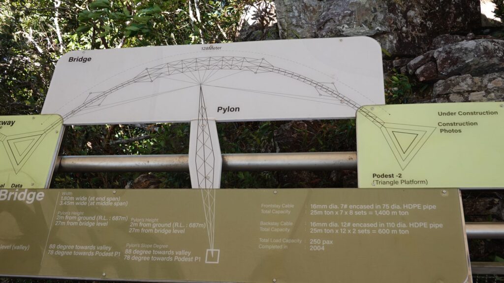 Bei der Bergstation angekommen sind noch ca 300 Stufen bis zur Brücke zu bewältigen. Dann kann man in schwindelerregender Höhe über die Brücke gehen und die tolle Aussicht bewundern. Da ziemlich starker Wind geht, bewegt sich die Brücke etwas – für Mariella schon etwas viel, für Poldi ist das gar nix.