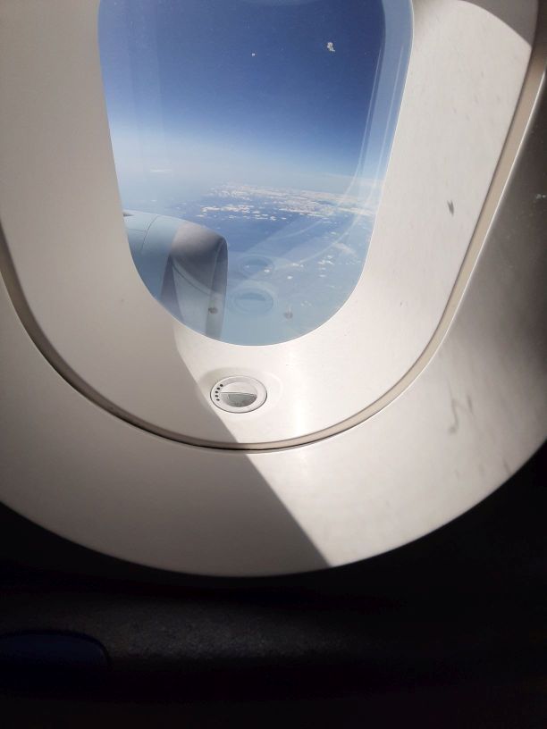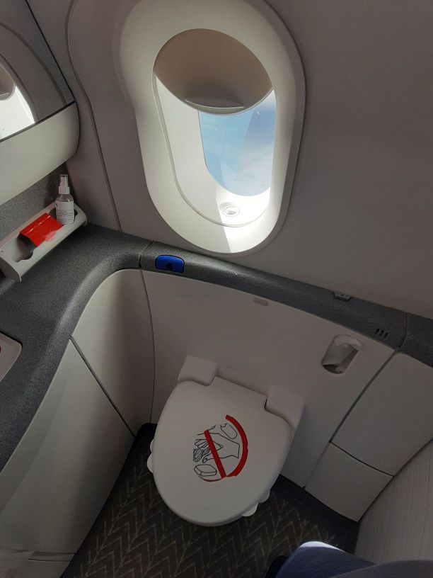 Was mich besonders zum Schmunzeln gebracht hat: das WC hat ein Fenster 🙂 🙂 Das hab ich noch nie in einem Flugzeug gesehen! A propos Kabinenfenster: die haben keine Jalousie sondern das Glas kann elektronisch heller und dunkler gestellt werden …